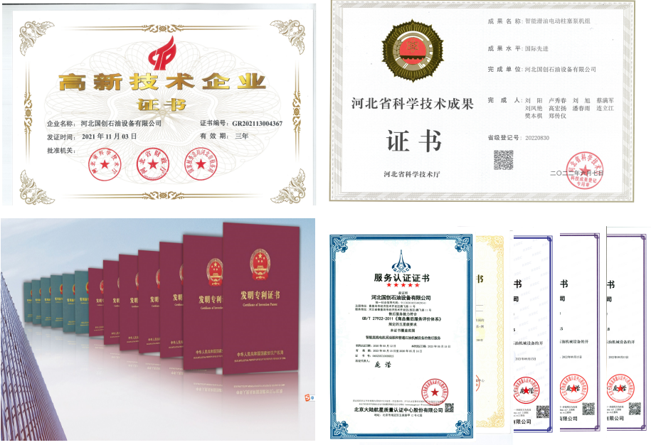 吉林油田公司承包商市场准入资质、中国石油吐哈油田市场准入资质;建立了经河北省工信厅认定的企业A级研发机构;并通过多项管理体系及售后服务评价体系认证,拥有多项国家专利(详见企业简介)。